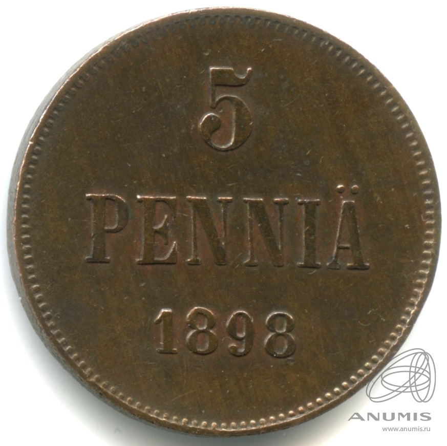 Монета регионального выпуска: 5 пенни 1898 года «Для Финляндии. Вензель Николая II». 5 пенни 1865 — 1917 гг. Российская Империя: Николай II (1894 — 1917). Медь, 6 г, ø 25 мм, Гурт: Гладкий. Тираж: 1154349 шт.
