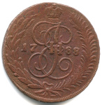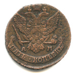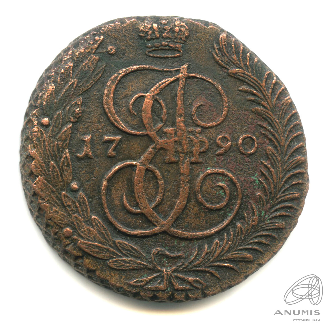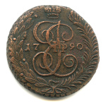 Монета регулярного выпуска: 5 копеек 1790 года «Вензель императрицы Екатерины II Великой. Аннинск». 5 копеек 1763 — 1796 гг. Российская Империя: Екатерина II (1762 — 1796). Монетный двор: Аннинская монета, с. Аннинское, Пермской губернии. Медь, 51 г, ø 42−43 мм, Гурт: Узор. Тираж: 20076521 шт.