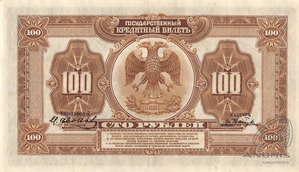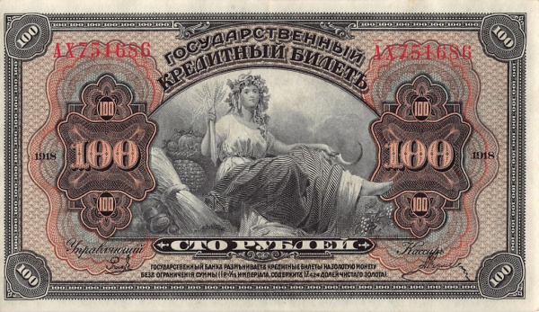 100 рублей Временное Правительство Дальнего Востока. 1918 (1920). Четыре подписи. Литеры АХ. Медведев