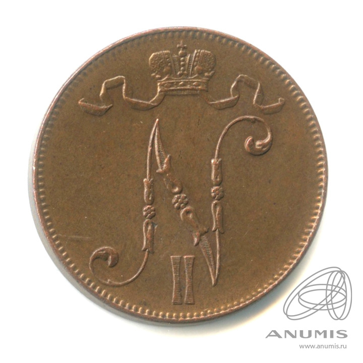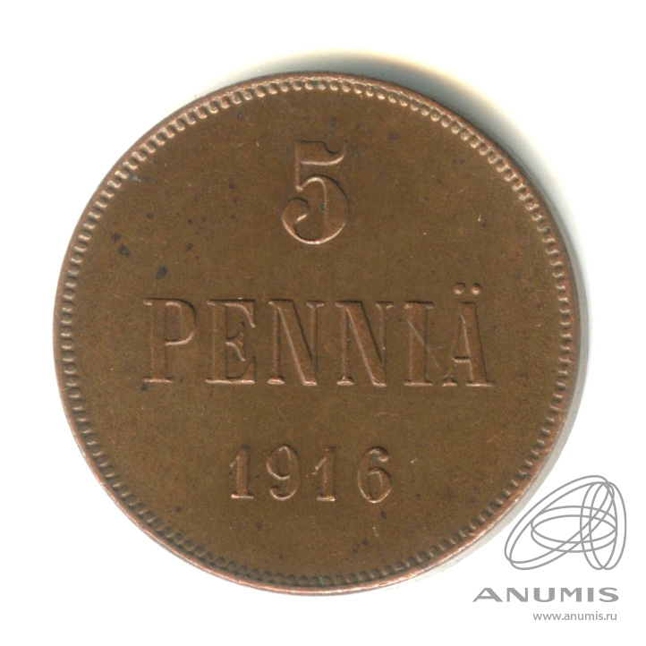 Монета регионального выпуска: 5 пенни 1916 года «Для Финляндии. Вензель Николая II». 5 пенни 1865 — 1917 гг. Российская Империя: Николай II (1894 — 1917). Медь, 6 г, ø 25 мм, Гурт: Гладкий. Тираж: 4463000 шт.