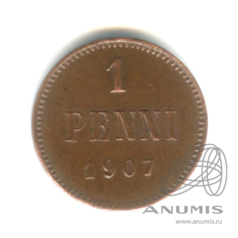 Монета регионального выпуска: 1 пенни 1907 года «Для Финляндии. Вензель Николая II». 1 пенни 1864 — 1917 гг. Российская Империя: Николай II (1894 — 1917). Медь, 1 г, ø 15 мм, Гурт: Гладкий. Тираж: 2484517 шт.