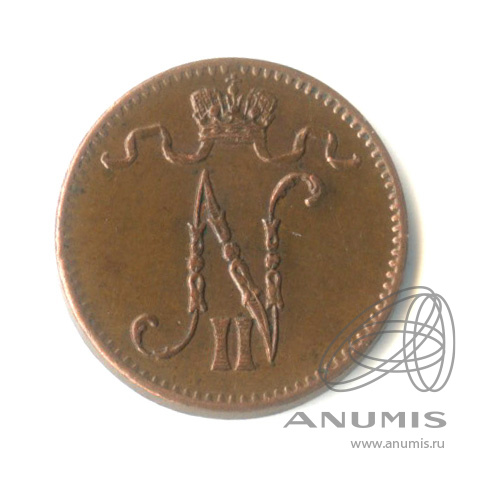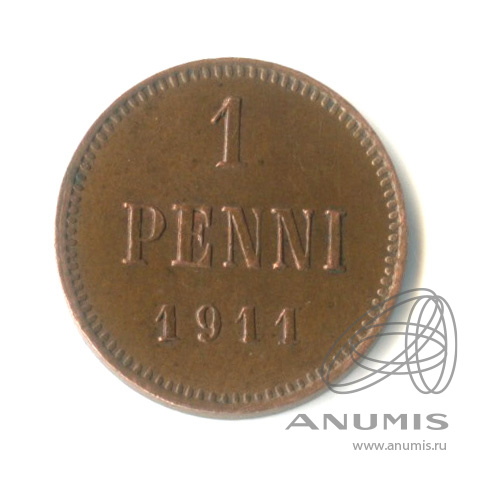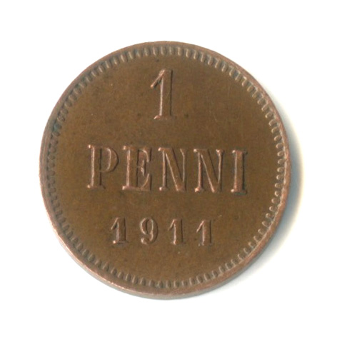 Монета регионального выпуска: 1 пенни 1911 года «Для Финляндии. Вензель Николая II». 1 пенни 1864 — 1917 гг. Российская Империя: Николай II (1894 — 1917). Медь, 1 г, ø 15 мм, Гурт: Гладкий. Тираж: 2550000 шт.