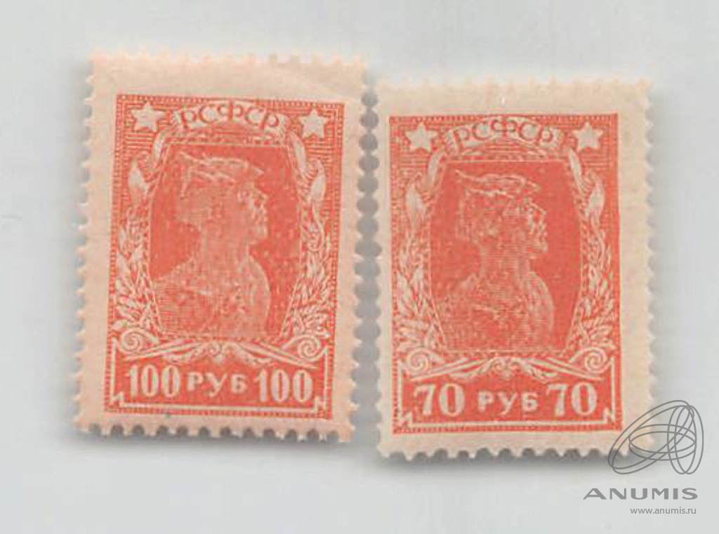Лот почтовых марок. РСФСР. Стандарт 1922 года. 100 руб. № 94 и 70 руб. № 93 I (Ошибка цвета) (Загорский 3100 руб. для *) Клей, малозаметный след от наклейки. ** и *
