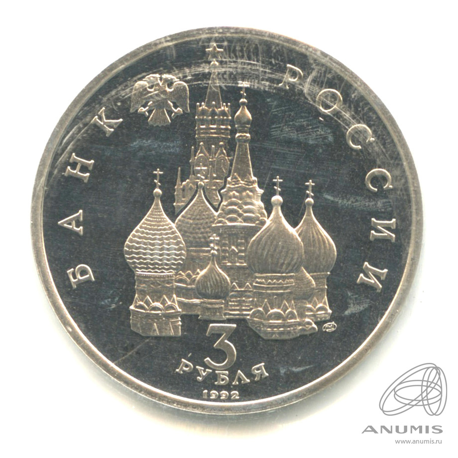 в центре диска — рельефное изображение куполов собора Покрова на Рву на Красной площади и Спасской башни Московского кремля, слева вверху — двуглавый орёл с опущенными крыльями, под собором справа — товарный знак монетного двора, внизу в центре в три строки — номинал и год выпуска: «3 РУБЛЯ 1992»; вдоль канта по окружности — надписи, слева: «БАНК», справа: «РОССИИ».