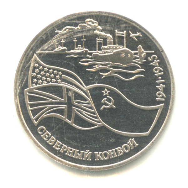 Юбилейная монета: 3 рубля 1992 года «Северный Конвой». 50 лет Победы в Великой Отечественной Войне. Российская Федерация: Банк России (1992 — 1996). Медь-никель, 14 г, ø 33 мм, Гурт: Надпись. Тираж: 400000 шт. Серия: 50-летие Победы в Великой Отечественной войне 1941−1945 гг.