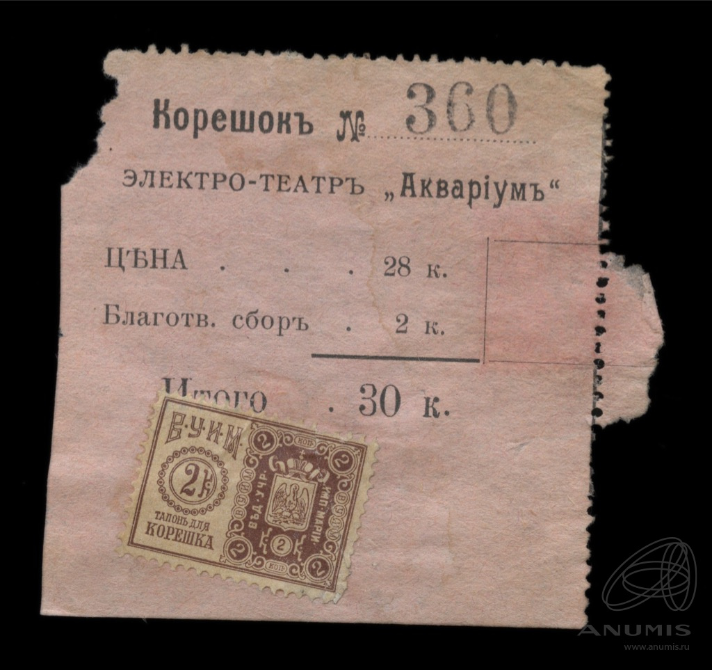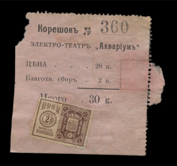 Корешок. Электро-театр «Аквариум». С непочтовой маркой «ВУИМ», 2 копейки — налог на зрелища и увеселения