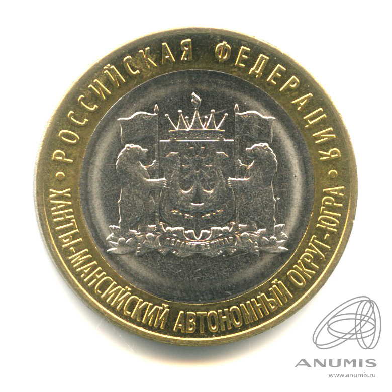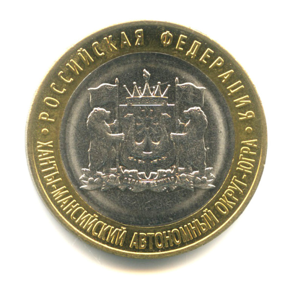 Юбилейная монета: 10 рублей 2024 года «Ханты-Мансийский автономный округ — Югра». Российская Федерация. Российская Федерация: Россия современная (1997 — 2020). Монетный двор: Московский монетный двор, г. Москва. Биметалл, 8 г, ø 27 мм, Гурт: Рубчатый. Тираж: 1 000 000 шт. Серия: Российская Федерация.