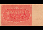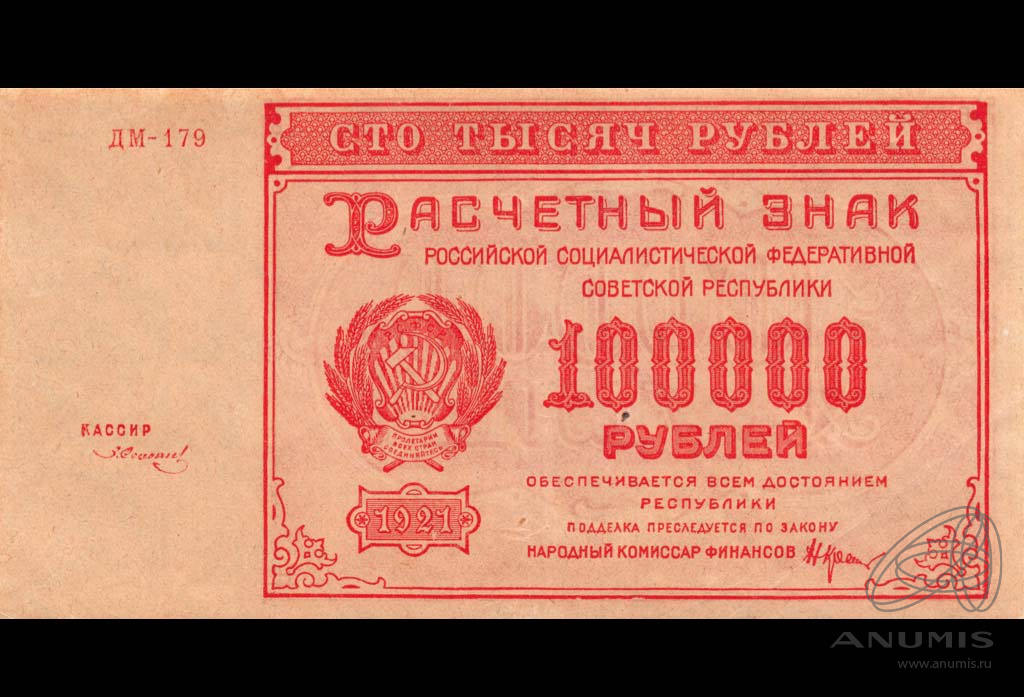 Банкнота регулярного выпуска: 100000 рублей 1921 года «Нарком фин. Крестинский. Солонинин». Расчетные знаки РСФСР 1921 г. Российская Советская Федеративная Социалистическая Республика: РСФСР (1919 — 1923).
