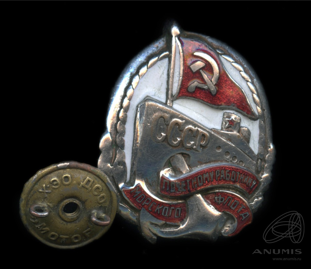 Знак «Почетному работнику морского флота СССР». Крепление: винт. Тяжелый, эмаль. Бронза. Серебрение