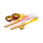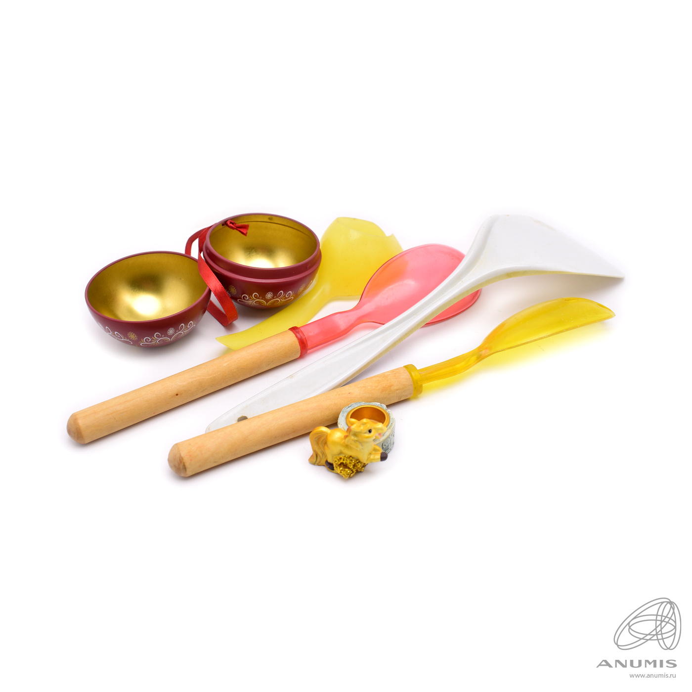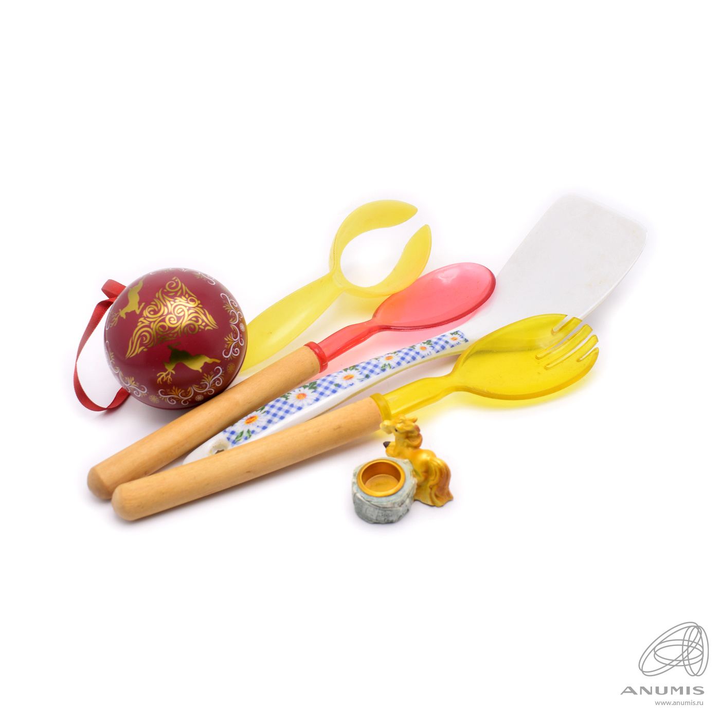 Лот посуды и декоративные элементы: лопатка, ложка и вилка с деревянными ручками, елочный шар и статуэтка собаки. 6 штук