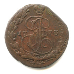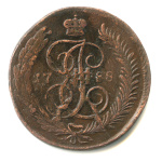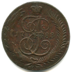5 копеек — Вензель императрицы Екатерины II Великой. Санкт-Петербург 1788 СПМ. Кабинетная патина. По данным портала M-dv один из четырех лучших из 132 экземпляров в коллекционном обороте по наблюдениям с 1983 года
