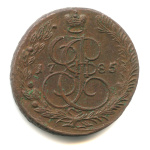 5 копеек — Вензель императрицы Екатерины II Великой. Орел 1780 г. Екатеринбург 1785 ЕМ