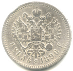 В центре изображен Малый Государственный Герб Российской империи — двуглавый орёл, головы которого увенчаны двумя коронами, третья, большая корона над ними. Все они соединены орденской лентой ордена Св. Апостола Андрея Первозванного. На груди орла расположен Московский герб, в щите изображен Георгий Победоносец с копьем поражающий дракона. Вокруг щита цепь ордена Св. Апостола Андрея Первозванного. На крыльях изображены гербы: Царства Казанского, Польского, Херсонеса Таврического, Астраханского, Сибирского, Грузинского и герб соединенных княжеств Киевского, Новгородского и Владимирского — по 4 на каждое крыло. В правой лапе орла — скипетр, в левой — держава. Под ним слева направо изображены: номинал — надпись «РУБЛЬ», цветочная розетка и дата выпуска «1896 Г.». По окружности канта имеются рельефные элементы, выполненные в виде зубцов.
