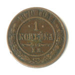 В центре монеты изображен Малый Государственный Герб Российской империи — двуглавый орел, головы которого увенчаны двумя коронами, третья, большая корона над ними. Все они соединены лентой Андрея Первозванного. В правой лапе орла — скипетр, в левой — держава. На его груди расположен Московский герб, в щите изображен Георгий Победоносец с копьем поражающий дракона. Вокруг щита цепь ордена Св. Апостола Андрея Первозванного. На крыльях орла изображены гербы: Царства Казанского, Польского, Херсонеса Таврического, Астраханского, Сибирского, Грузинского и герб соединенных княжеств Киевского, Новгородского и Владимирского — по 4 на каждое крыло. По окружности — две полукруглые плашки, соединенные узорами. На верхней плашке выпуклая надпись: «МЕДНАЯ РОССИЙСКАЯ МОНЕТА». На нижней плашке, изображенной в виде ленты, углубленная надпись: «ОДНА КОПЕЙКА».