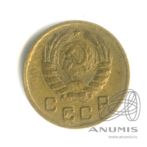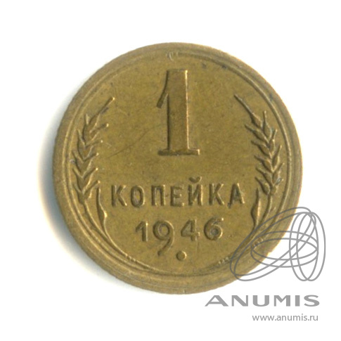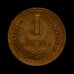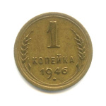 Монета регулярного выпуска: 1 копейка 1946 года «Венок 11 лент». 1 копейка 1937 — 1946 гг. Союз Советских Социалистических Республик: СССР ранний (1924 — 1958). Бронза, 1 г, ø 15 мм, Гурт: Рубчатый.