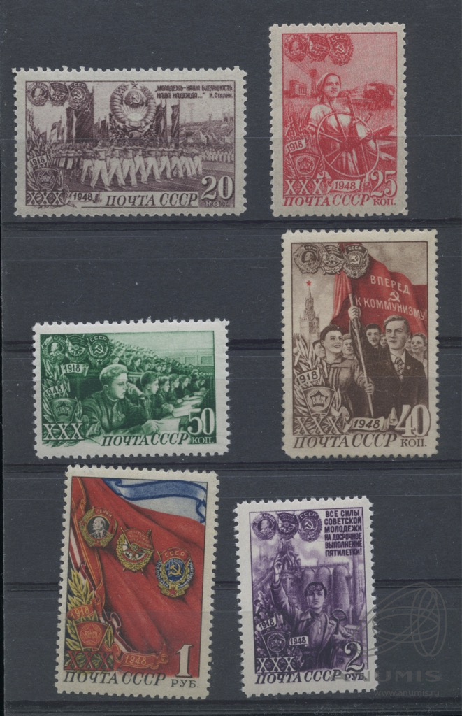 Лот марок: серия почтовых негашеных марок «30-летие ВЛКСМ» (полная, 6 марок), -**, стоимость по каталогу Загорского ред. 2023 г. 11500 руб. для **. состояние:-**, ориг. клей без следов наклейки