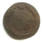 5 копеек — Вензель императрицы Екатерины II Великой. Орел 1768 г. Екатеринбург 1776 ЕМ