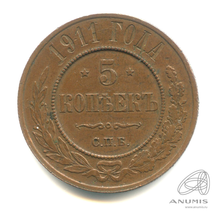 Монета регулярного выпуска: 5 копеек 1911 года. 5 копеек 1867 — 1917 гг. Российская Империя: Николай II (1894 — 1917). Монетный двор: Санкт-Петербургский монетный двор, г. Санкт-Петербург. Медь, 16 г, ø 33 мм, Гурт: Рубчатый. Тираж: 3800009 шт.