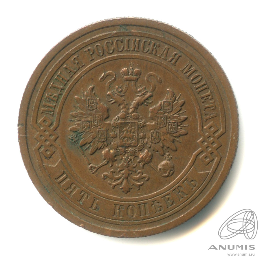 В центре монеты изображен Малый Государственный Герб Российской империи — двуглавый орел, головы которого увенчаны двумя коронами, третья, большая корона над ними. Все они соединены лентой Андрея Первозванного. В правой лапе орла — скипетр, в левой — держава. На его груди расположен Московский герб, в щите изображен Георгий Победоносец с копьем поражающий дракона. Вокруг щита цепь ордена Св. Апостола Андрея Первозванного. На крыльях орла изображены гербы: Царства Казанского, Польского, Херсонеса Таврического, Астраханского, Сибирского, Грузинского и герб соединенных княжеств Киевского, Новгородского и Владимирского — по 4 на каждое крыло. По окружности — две полукруглые плашки, соединенные узорами. На верхней плашке выпуклая надпись: «МЕДНАЯ РОССИЙСКАЯ МОНЕТА». На нижней плашке, изображенной в виде ленты, углубленная надпись: «ПЯТЬ КОПЕЕК».