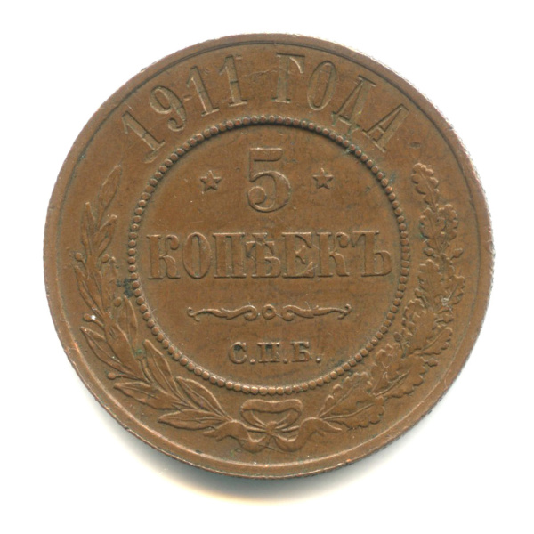 В центре указан номинал — цифра «5», ограниченная с обеих сторон звездочками. Под цифрой номинала — слово «КОПЕЕК». Ниже, расположен декоративный разделитель в виде двух изогнутых линий и небольшой окружности между ними. Под разделителем — обозначение монетного двора «С.П.Б.». Центральная часть отделена от остального изображения, окружностью в виде точек. В верхней части полукругом углубленная надпись: «1911 ГОДА». Вдоль канта изображен венок из лавровой и дубовой ветвей, которые, в нижней части, перевязаны лентой на узел бантом.