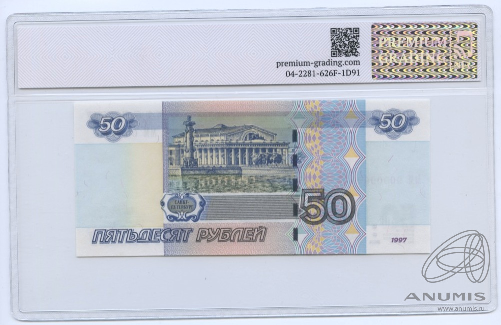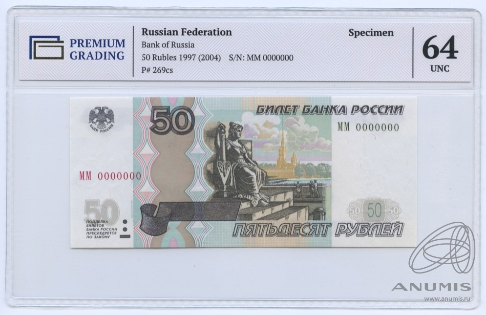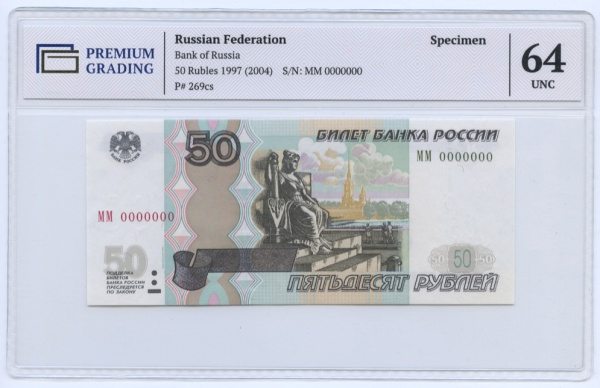 50 рублей 2004. В слабе. Образец. ММ 0000000. В слабе PREMIUM GRADING 64 UNC