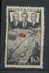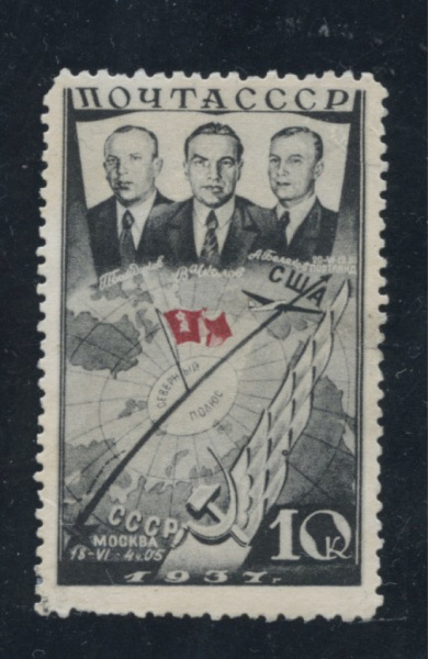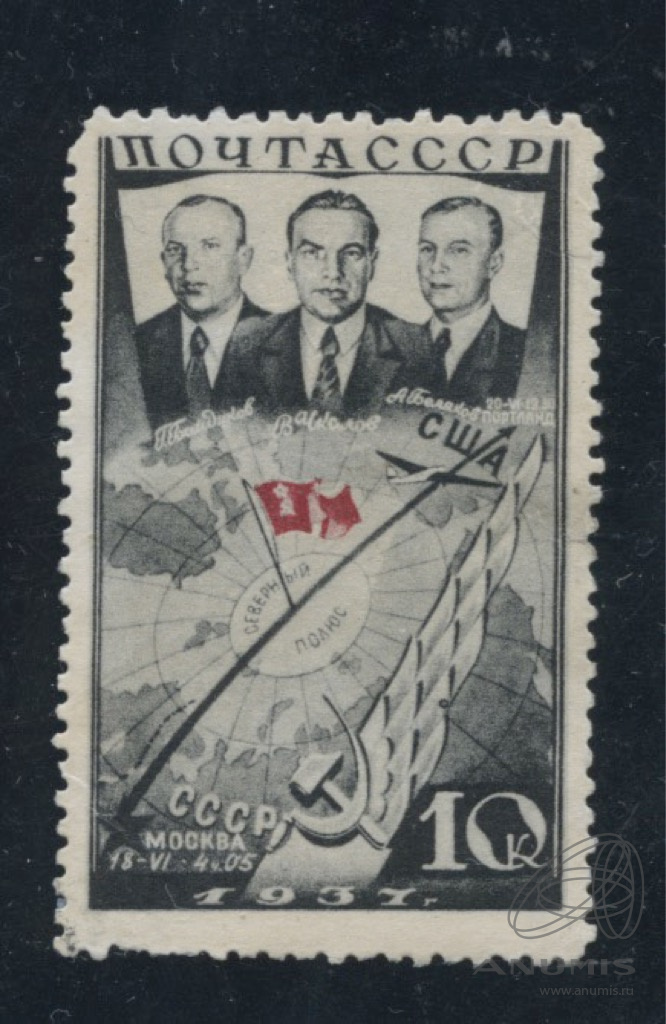Негашёная марка 10 копеек «Первый беспосадочный перелёт СССР-США через Северный полюс», редкая разновидность — «разорван флаг», **. стоимость по каталогу Загорского ред.2023 г. = 8 700 руб. для **
