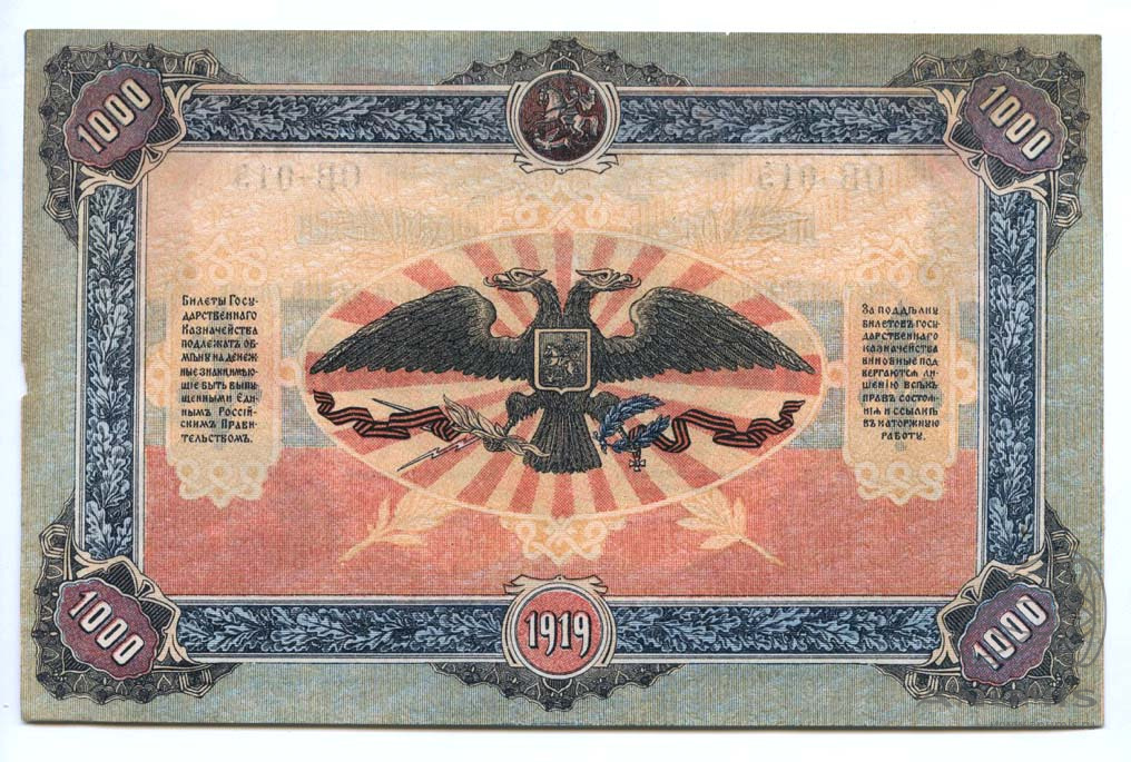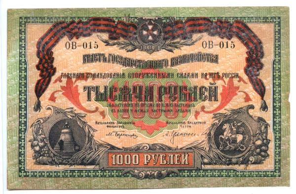 Банкнота специального выпуска: 1000 рублей 1919 года «Билет Государственного Казначейства, Главного Командования вооруженными силами на юге России. Без в/з, серия О». Главное Командование Вооруженными Силами на Юге России. Билеты Государственного Казначейства. Российская Империя/РСФСР: Гражданская война (1917 — 1923).