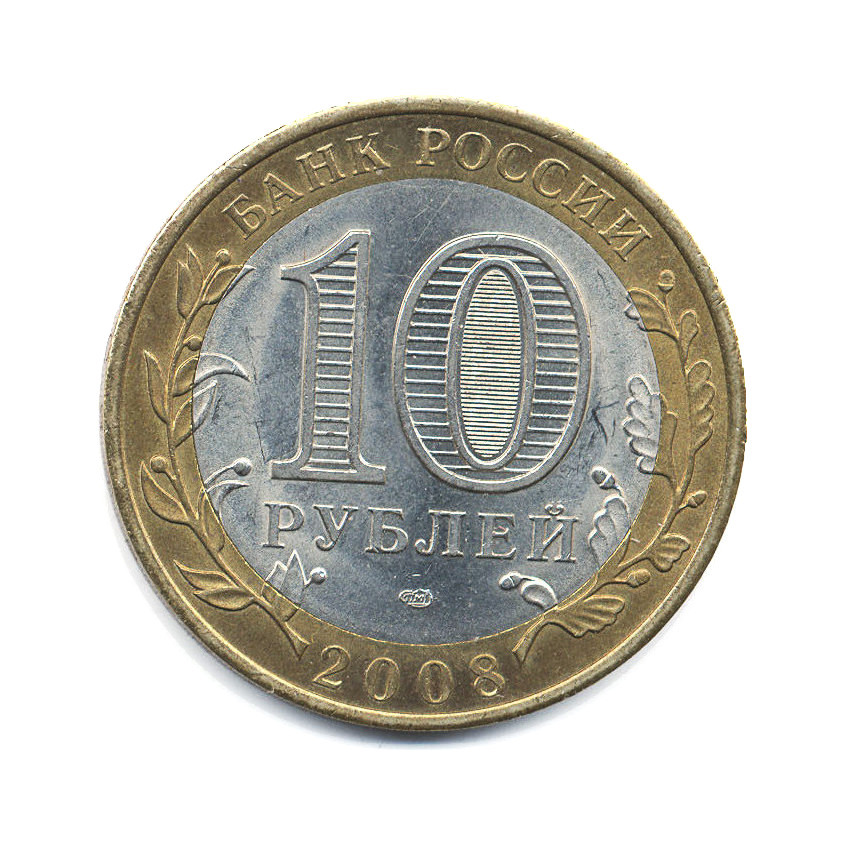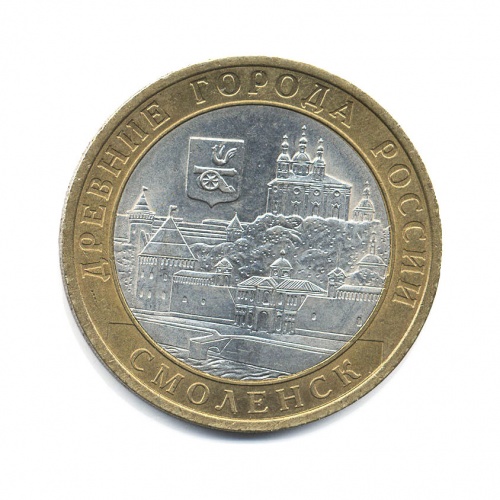 Юбилейная монета «10 рублей 2008 года „Древние города России - Смоленск“» Российская Федерация (1997 - 2013) (Россия) Монетный двор: «СПМД» — Санкт-Петербург Би-металл: центр - медно-никелевый сплав, кольцо - латунь