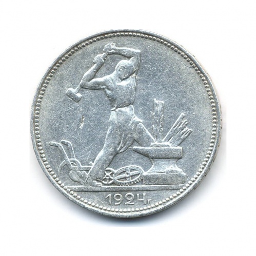 Монета регулярного выпуска «50 копеек 1924 года» Советский Союз (1924 - 1958) (СССР) Инициалы на гурте — «П.Л» (P.L.) — Петр Латышев — минцмейстер Ленинградского монетного двора Серебро 0.900