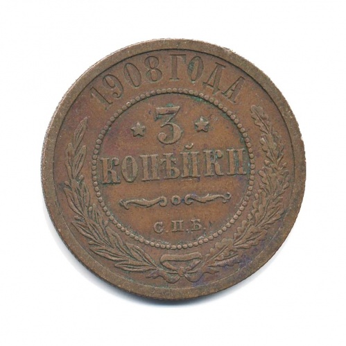 Монета регулярного выпуска «3 копейки 1908 года» 1895-1917 (Николай II) (Российская Империя) Монетный двор: Санкт-Петербургский монетный двор, Санкт-Петербург Медь