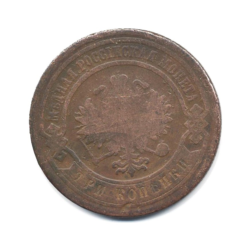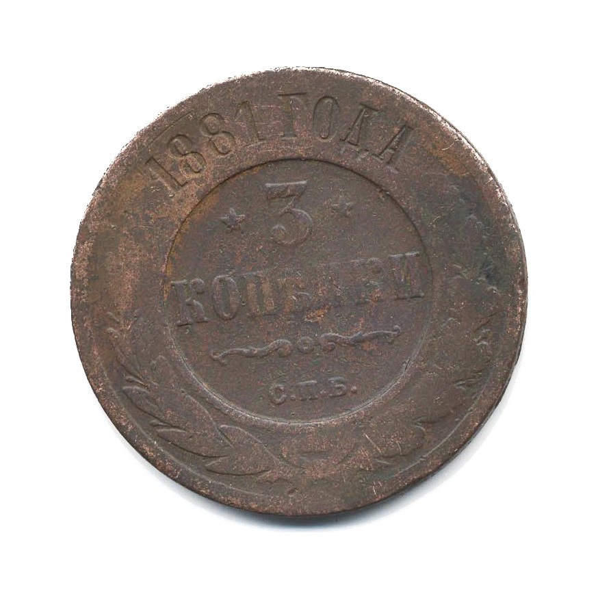 Монета регулярного выпуска «3 копейки 1881 года» 1855-1881 (Александр II) (Российская Империя) Монетный двор: Санкт-Петербургский монетный двор, Санкт-Петербург Медь