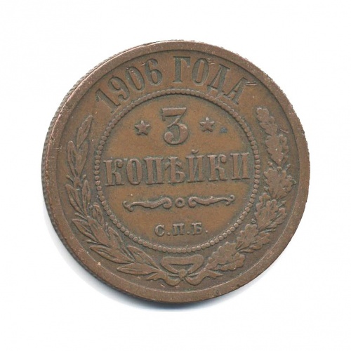 Монета регулярного выпуска «3 копейки 1906 года» 1895-1917 (Николай II) (Российская Империя) Монетный двор: Санкт-Петербургский монетный двор, Санкт-Петербург Медь