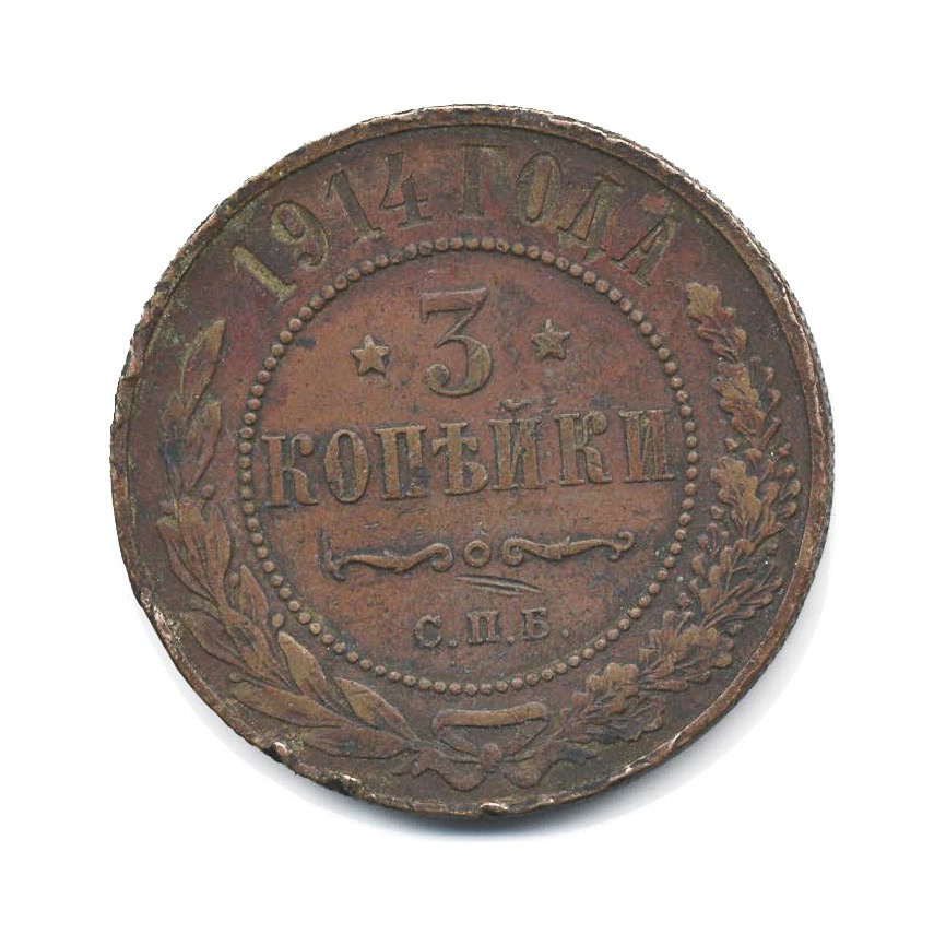 Монета регулярного выпуска «3 копейки 1914 года» 1895-1917 (Николай II) (Российская Империя) Монетный двор: Санкт-Петербургский монетный двор, Санкт-Петербург Медь