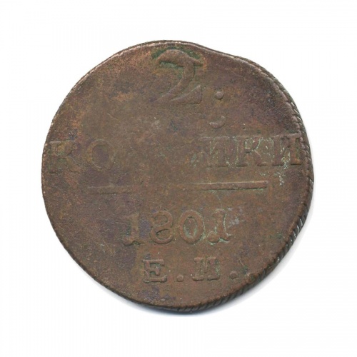 Монета регулярного выпуска «2 копейки 1801 года» 1796-1801 (Павел I) (Российская Империя) Монетный двор: Екатеринбургская монета, Екатеринбург Медь
