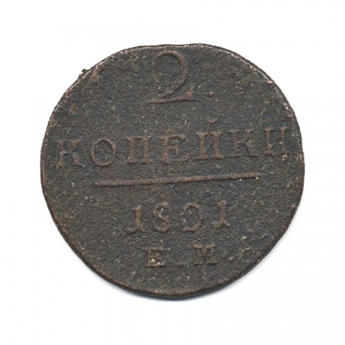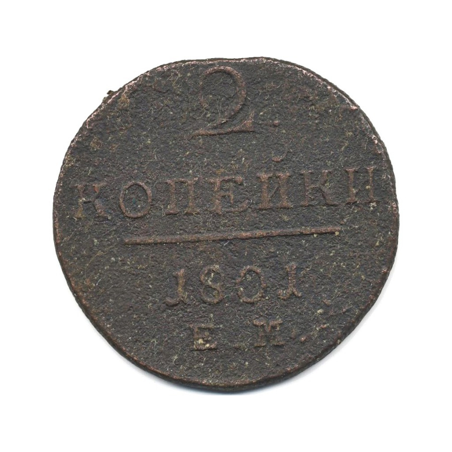 Монета регулярного выпуска «2 копейки 1801 года» 1796-1801 (Павел I) (Российская Империя) Монетный двор: Екатеринбургская монета, Екатеринбург Медь