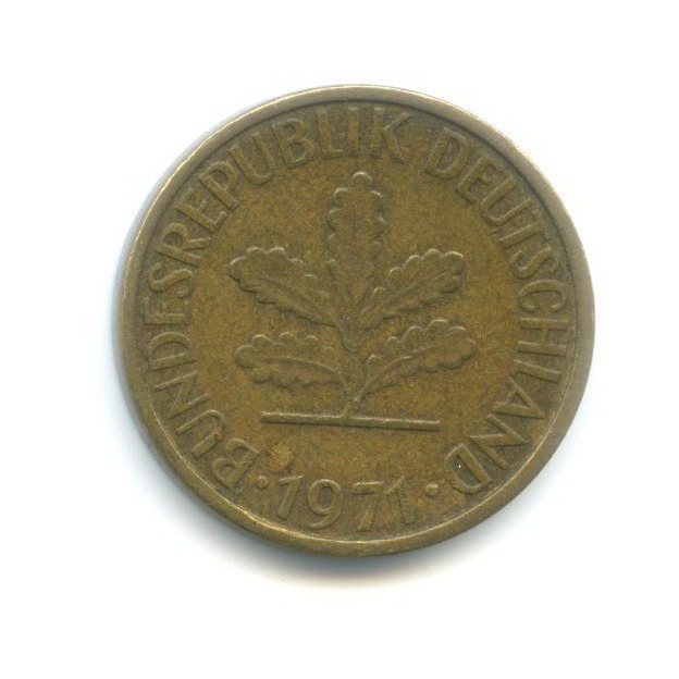 Монета регулярного выпуска «5 пфеннигов 1971 года» Западная Германия (ФРГ) (1948 - 1989) (Германия) Монетный двор: «F», Штутгарт Сталь с латунным покрытием
