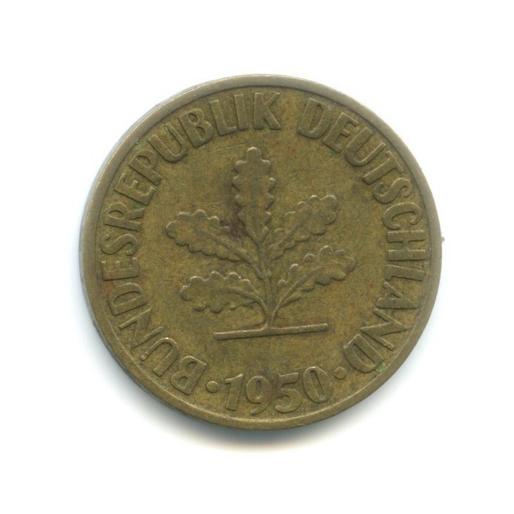 Монета регулярного выпуска «10 пфеннигов 1950 года» Западная Германия (ФРГ) (1948 - 1989) (Германия) Монетный двор: «D», Мюнхен Сталь с латунным покрытием