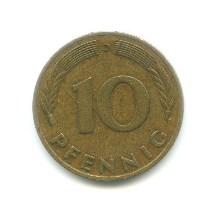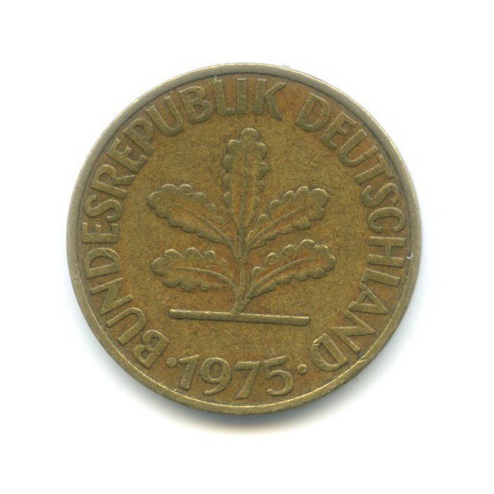 Монета регулярного выпуска «10 пфеннигов 1975 года» Западная Германия (ФРГ) (1948 - 1989) (Германия) Монетный двор: «D», Мюнхен Сталь с латунным покрытием