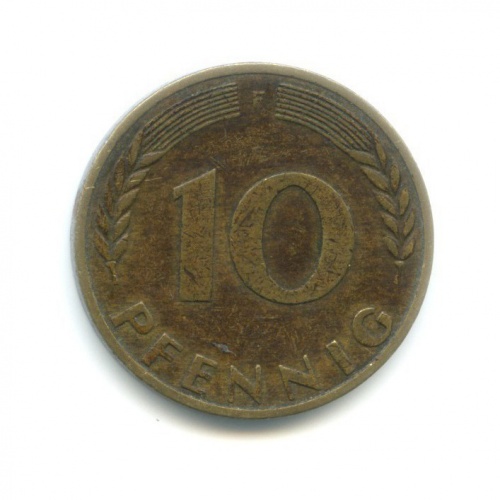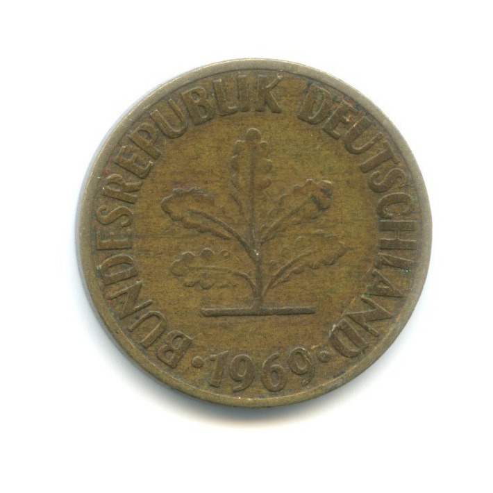 Монета регулярного выпуска «10 пфеннигов 1969 года» Западная Германия (ФРГ) (1948 - 1989) (Германия) Монетный двор: «F», Штутгарт Сталь с латунным покрытием