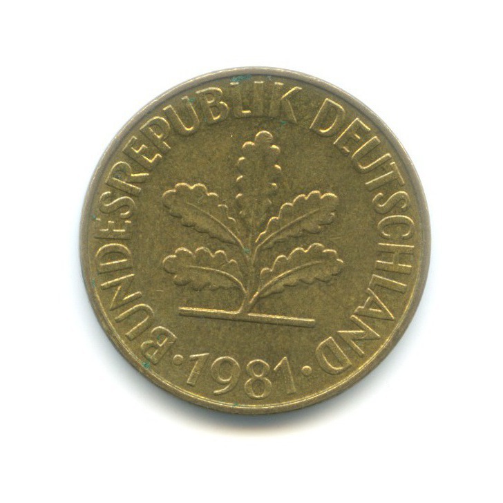 Монета регулярного выпуска «10 пфеннигов 1981 года» Западная Германия (ФРГ) (1948 - 1989) (Германия) Монетный двор: «F», Штутгарт Сталь с латунным покрытием