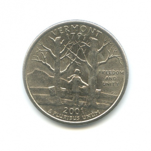 Юбилейная монета «25 центов (квотер) 2001 года „Квотер штата Вермонт“» Квотеры «50 штатов» (1999 - 2009) (США) Монетный двор: «P», Филадельфия Медь с медно-никелевым покрытием