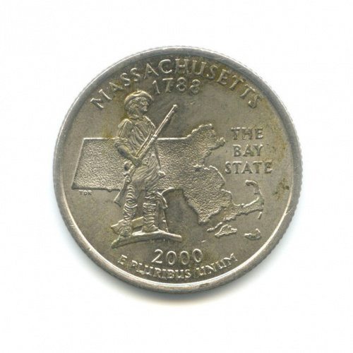 Юбилейная монета «25 центов (квотер) 2000 года „Квотер штата Массачусетс“» Квотеры «50 штатов» (1999 - 2009) (США) Монетный двор: «P», Филадельфия Медь с медно-никелевым покрытием
