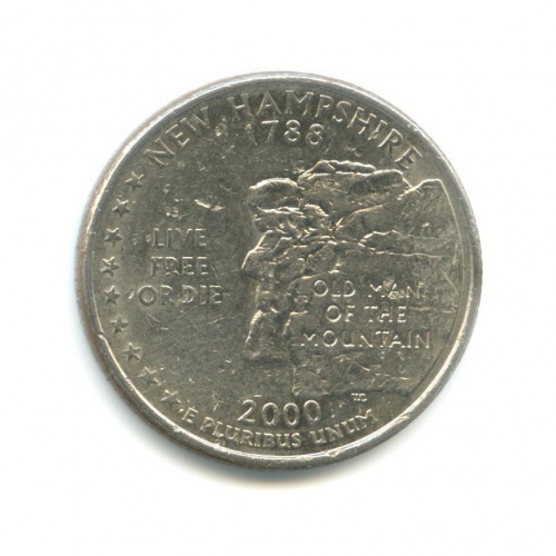 Юбилейная монета «25 центов (квотер) 2000 года „Квотер штата Нью-Гэмпшир“» Квотеры «50 штатов» (1999 - 2009) (США) Монетный двор: «P», Филадельфия Медь с медно-никелевым покрытием