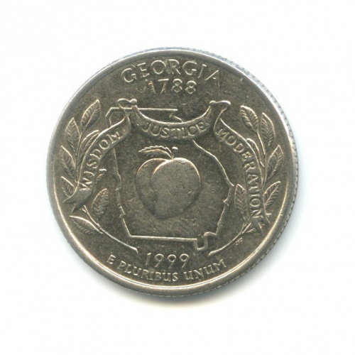 Юбилейная монета «25 центов (квотер) 1999 года „Квотер штата Джорджия“» Квотеры «50 штатов» (1999 - 2009) (США) Монетный двор: «D», Денвер Медь с медно-никелевым покрытием