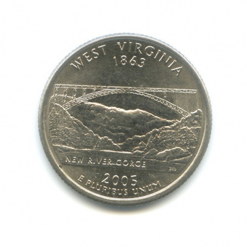 Юбилейная монета «25 центов (квотер) 2005 года „Квотер штата Западная Вирджиния“» Квотеры «50 штатов» (1999 - 2009) (США) Монетный двор: «P», Филадельфия Медь с медно-никелевым покрытием