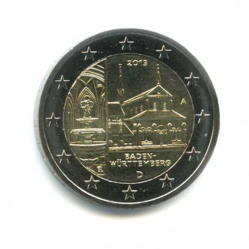 Юбилейная монета «2 евро 2013 года „Монастырь Маульбронн, Баден-Вюртемберг. Федеральные земли Германии.“» Европейский союз (Евро) (2002 - 2013) (Германия) Монетный двор: «D», Мюнхен Би-металл: центр - латунь, кольцо - медно-никелевый сплав