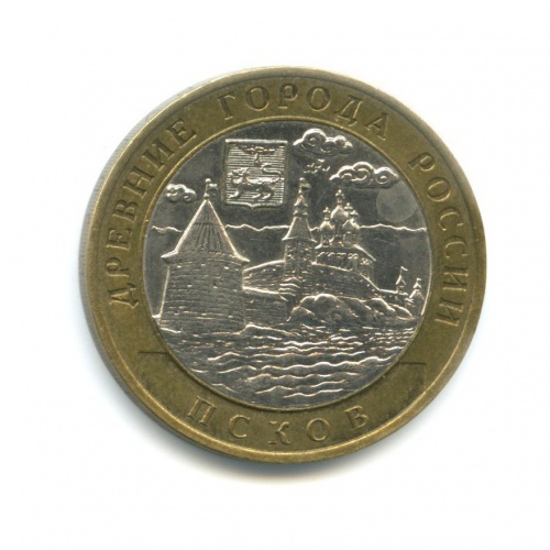Юбилейная монета «10 рублей 2003 года „Псков. Древние города России.“» Российская Федерация (1997 - 2013) (Россия) Монетный двор: «СПМД» — Санкт-Петербург Би-металл: центр - медно-никелевый сплав, кольцо - латунь