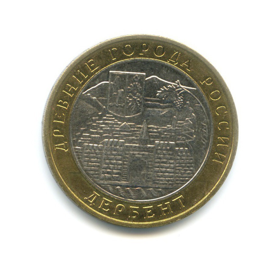 Юбилейная монета «10 рублей 2002 года „Дербент. Древние города России.“» Российская Федерация (1997 - 2013) (Россия) Монетный двор: «ММД» — Москва Би-металл: центр - медно-никелевый сплав, кольцо - латунь