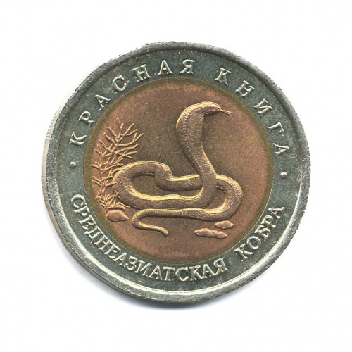 Юбилейная монета «10 рублей 1992 года „Среднеазиатская кобра. Красная книга.“» Банк России (1992 - 1996) (Россия) Би-металл: центр - алюминиевая бронза, кольцо - медно-никелевый сплав
