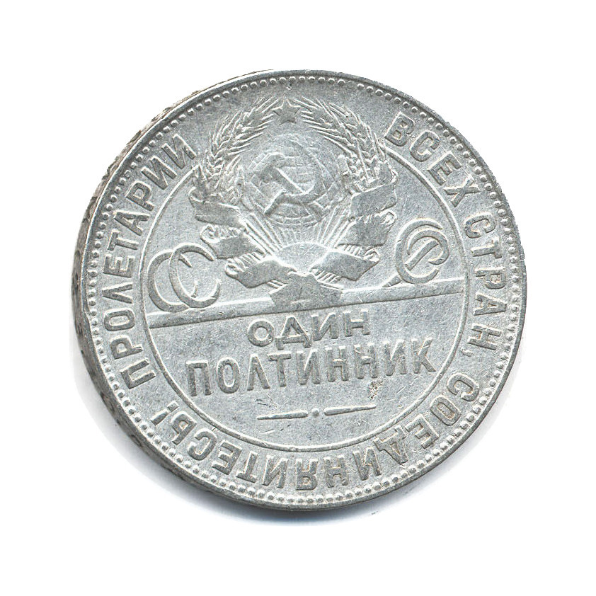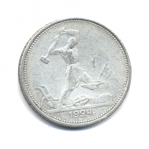 Монета регулярного выпуска «50 копеек 1924 года» Советский Союз (1924 - 1958) (СССР) Инициалы на гурте — «T.P.» (T.R.) — Томас Росс — минцмейстер Лондонского Монетного Двора Серебро 0.900